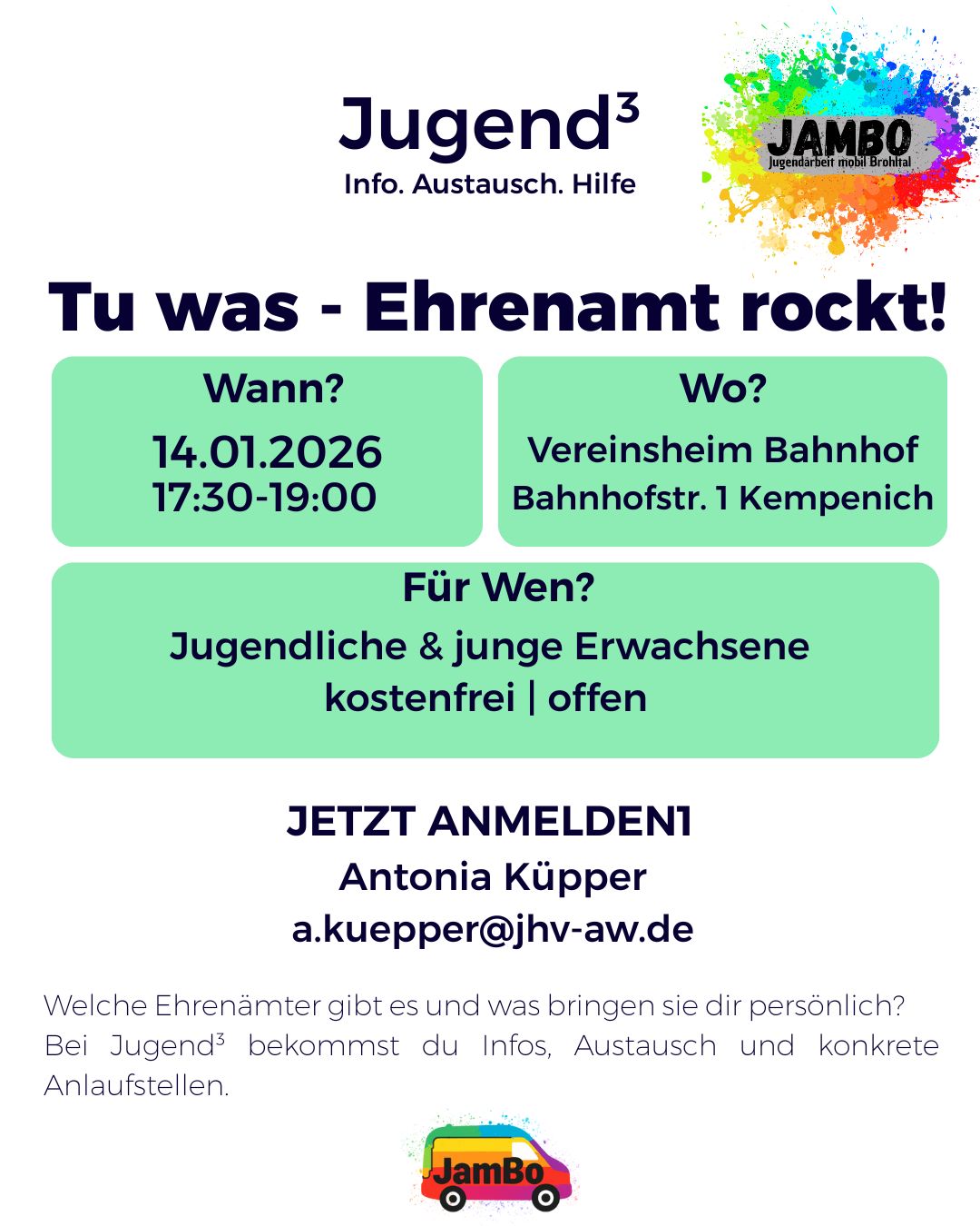 JamBo wünscht ein frohes neues Jahr und startet mit Vollgas ins Jahr 2026. Was heißt das? JamBo startet mit seiner 1. Veranstaltung von Jugend³. Wer kommen mag, gerne unter der Email a.kuepper@jhv-aw.de anmelden. JamBo freut sich auf alle, die kommen.